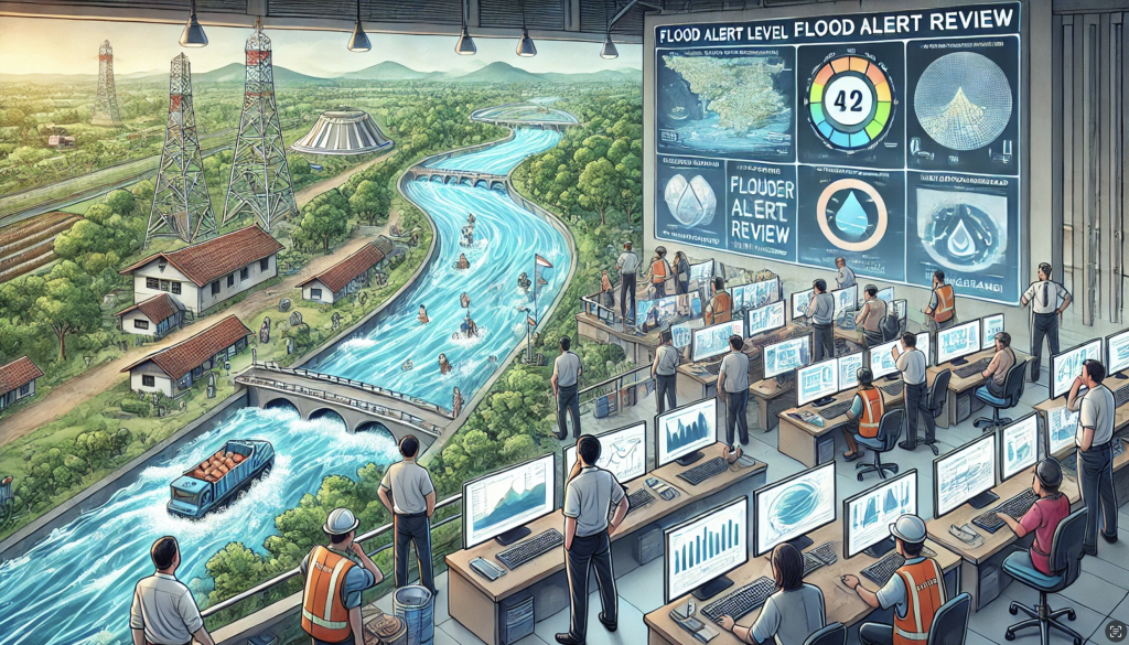 The Flood Alert Level Review for Cirarab River was conducted to assess the causes of severe flooding in Tangerang and to formulate effective mitigation strategies. The study identified key issues, including obstructed river flow due to bridge structures, inadequate embankment elevation in Gelam Jaya Village, and sedimentation and narrowing near Akong Factory in Sepatan District. These factors significantly contributed to prolonged flooding, necessitating urgent river normalization and infrastructure improvements. The study also revealed that six out of sixteen drainage gatesalong the Cirarab River embankment were non-functional, limiting the flood drainage capacity, especially in Villa Permata Tangerang. Additionally, the Sarakan Dam, located on the border of Gitung Village and Kosambi Village, remained structurally intact but had three damaged floodgates that were temporarily replaced with wooden partitions.